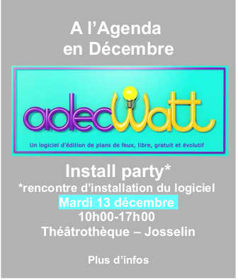Il s’est agi de créer à la fois une bibliothèque des plans des salles du Morbihan, avec toutes leurs caractéristiques d’accroche, de puissance électrique etc., et une bibliothèque des projecteurs de théâtre, avec tous leurs symboles et caractéristiques. Dans quel but ? Faciliter la création de nos plans de feux et leur communication. Il ne tient qu’à nous tous d’enrichir la bibliothèque des plans de salles et celle des projecteurs, grâce à nos apports collectifs et continus.